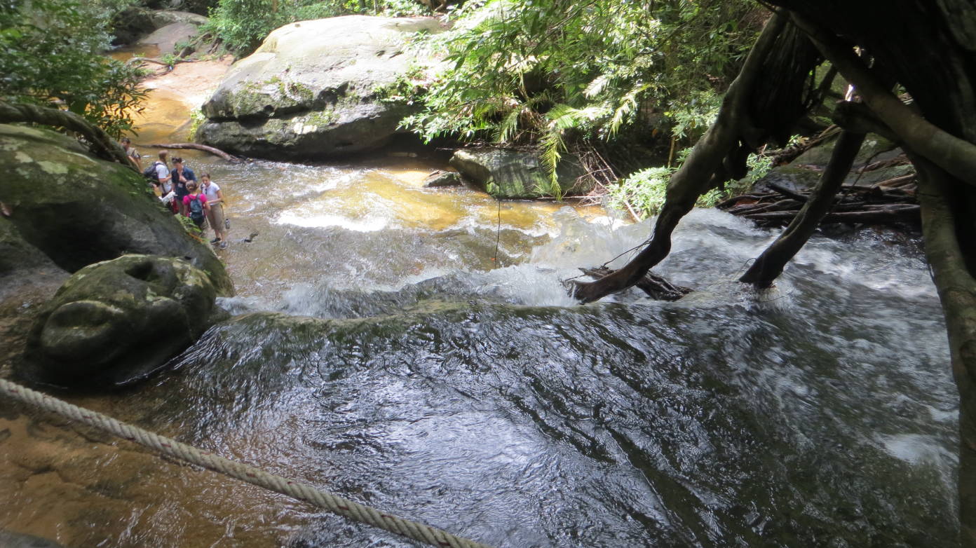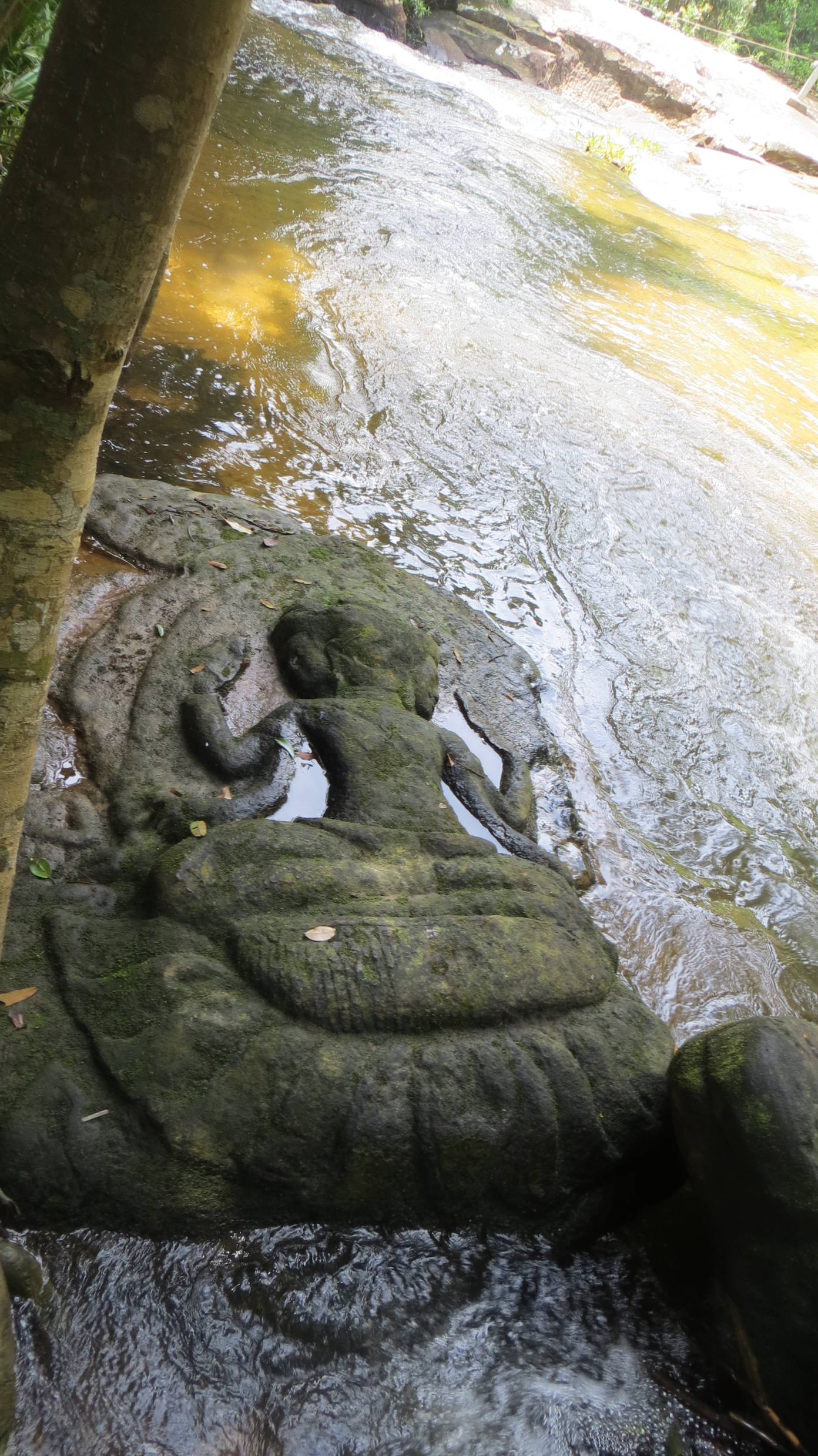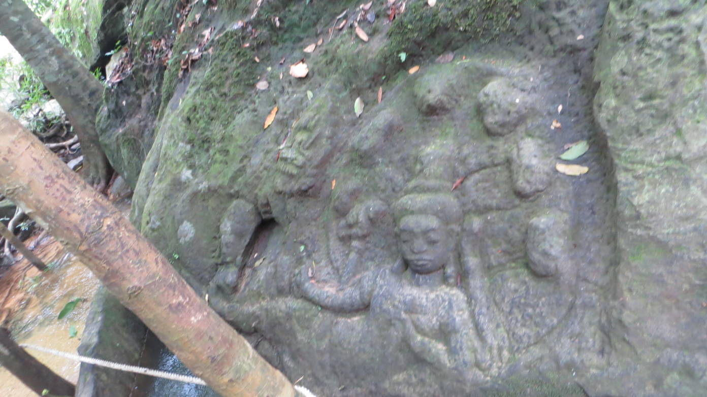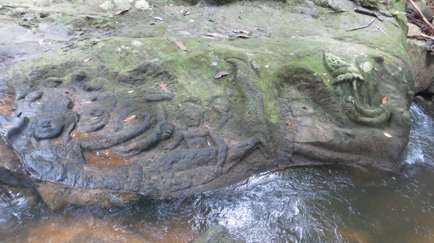 Tras esta visita, continuamos hacia el Kbal Spean que se encuentra en la misma carretera que elBanteay Srei, pero más alejado, a unos 50 kilómetros de Siem Reap. El Kbal Spean no es un templo, sino un río cuyo lecho de piedra ha sido tallado con figuras decorativas. El Kbal Speantambién se conoce como el río de las mil lingas, por las figuras circulares que decoran su cauce. Para llegar hay que caminar dos kilómetros por un sendero que asciende una montaña. El río tiene una cascada donde es posible darse un baño refrescante.