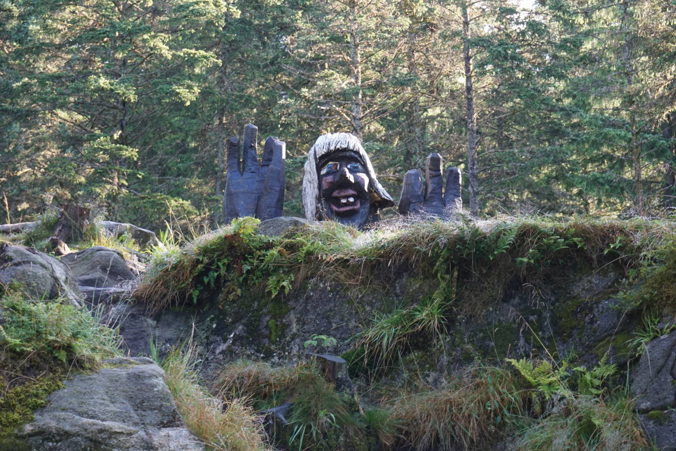 Al llegar, nos encontramos con un paisaje impresionante, perfecto para pasear y disfrutar del aire fresco. Decidimos explorar el Bosque de los Trolls. Este encantador sendero está rodeado de árboles, creando una atmósfera mágica y misteriosa, como sacada de un cuento. El bosque es famoso por sus esculturas de trolls, que según las leyendas locales, habitan en estas tierras. Cada rincón invita a la aventura, mientras el sendero serpentea por un entorno natural intacto, ideal para relajarse o disfrutar de la naturaleza.