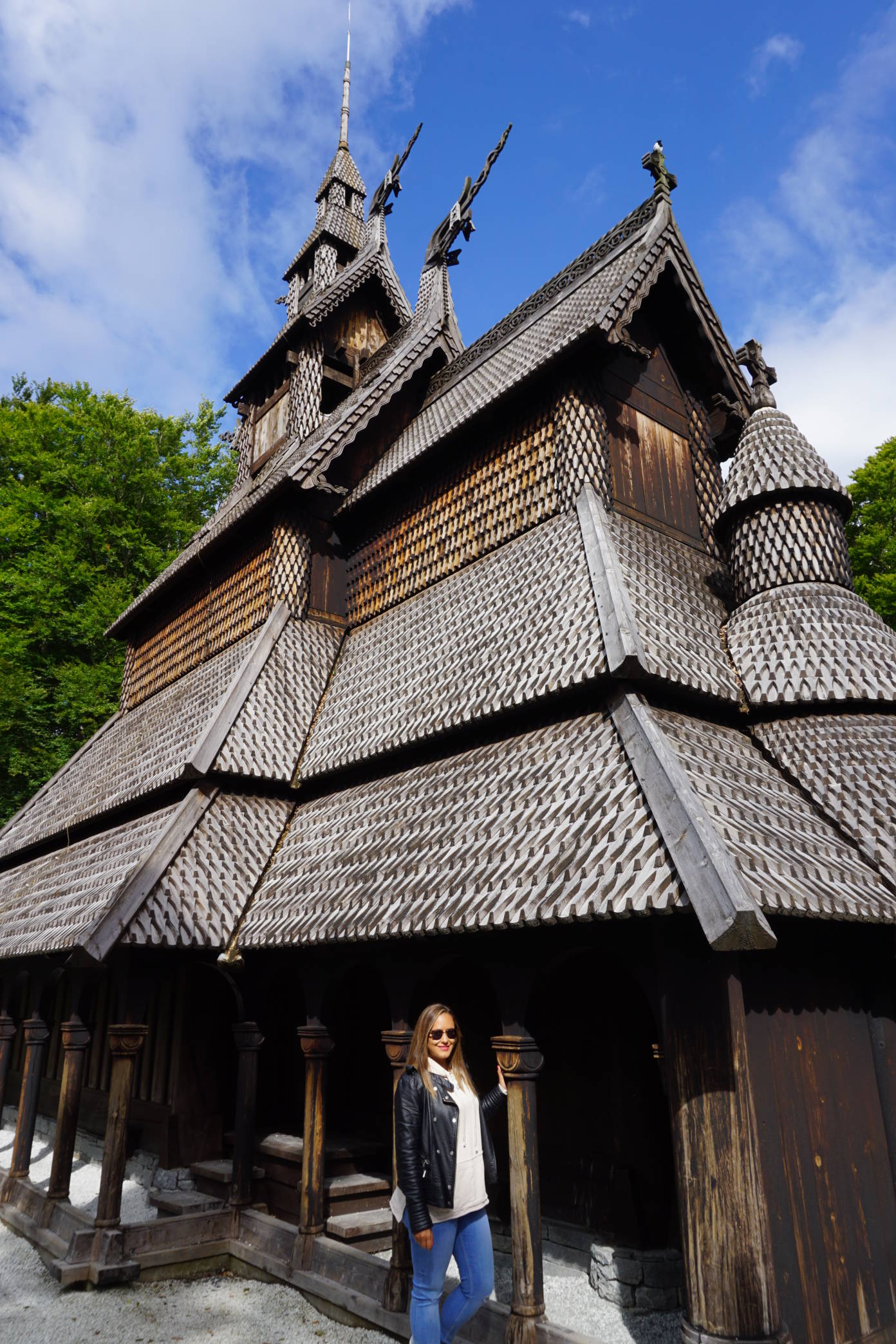 Una vez allí, nos entregan el coche y nos ponemos en marcha para comenzar nuestro road trip por Noruega. La primera parada de hoy será la Iglesia de Madera de Fortun. Este hermoso edificio, reconstruido en 1992 después de ser destruido por un incendio, es una réplica de una iglesia vikinga que data de la Edad Media. Con su arquitectura tradicional, de madera oscura, la iglesia parece sacada de un cuento antiguo. Además, su ubicación en un pintoresco paisaje de montañas y fiordos la convierte en una visita obligada para los amantes de la historia y la arquitectura.