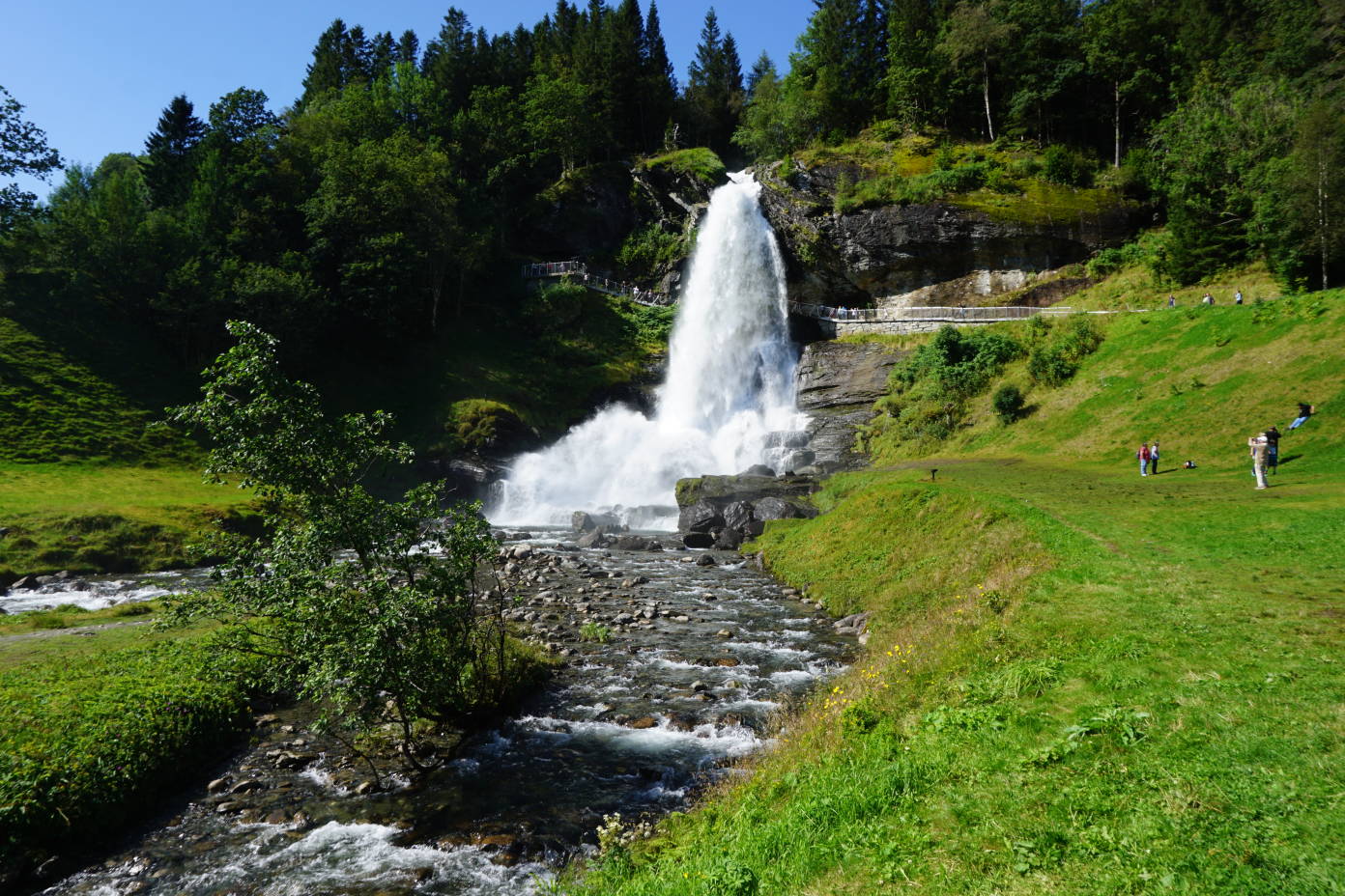 Poco después, nos dirigimos a Steinsdalsfossen, una de las cascadas más famosas de la región. Lo más destacado de esta caída de agua es el sendero que pasa por detrás de la cascada, lo que nos permite caminar por dentro del agua y ver la caída desde una perspectiva completamente diferente. El agua cae desde una altura impresionante y la vegetación que la rodea crea un contraste vibrante con el color turquesa del agua. Este acceso único hace que Steinsdalsfossen sea una experiencia aún más especial. Las vistas panorámicas desde el sendero ofrecen una perspectiva increíble de la cascada y el paisaje circundante, siendo un excelente lugar para hacer fotos y disfrutar de la majestuosidad de la naturaleza noruega. Sin duda, estas cascadas son una parada imprescindible en cualquier recorrido por los fiordos de Noruega.