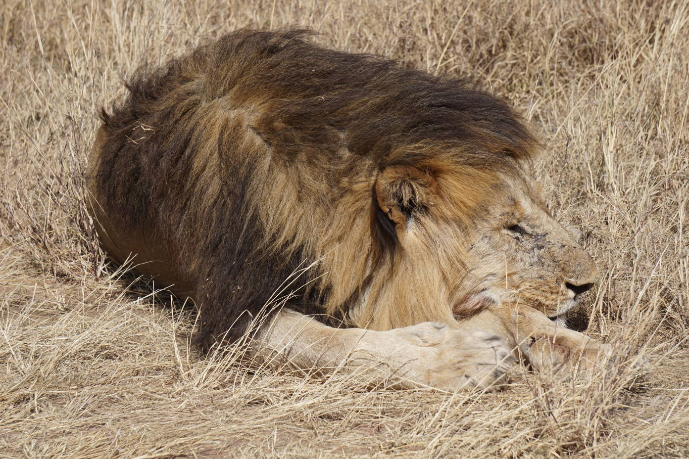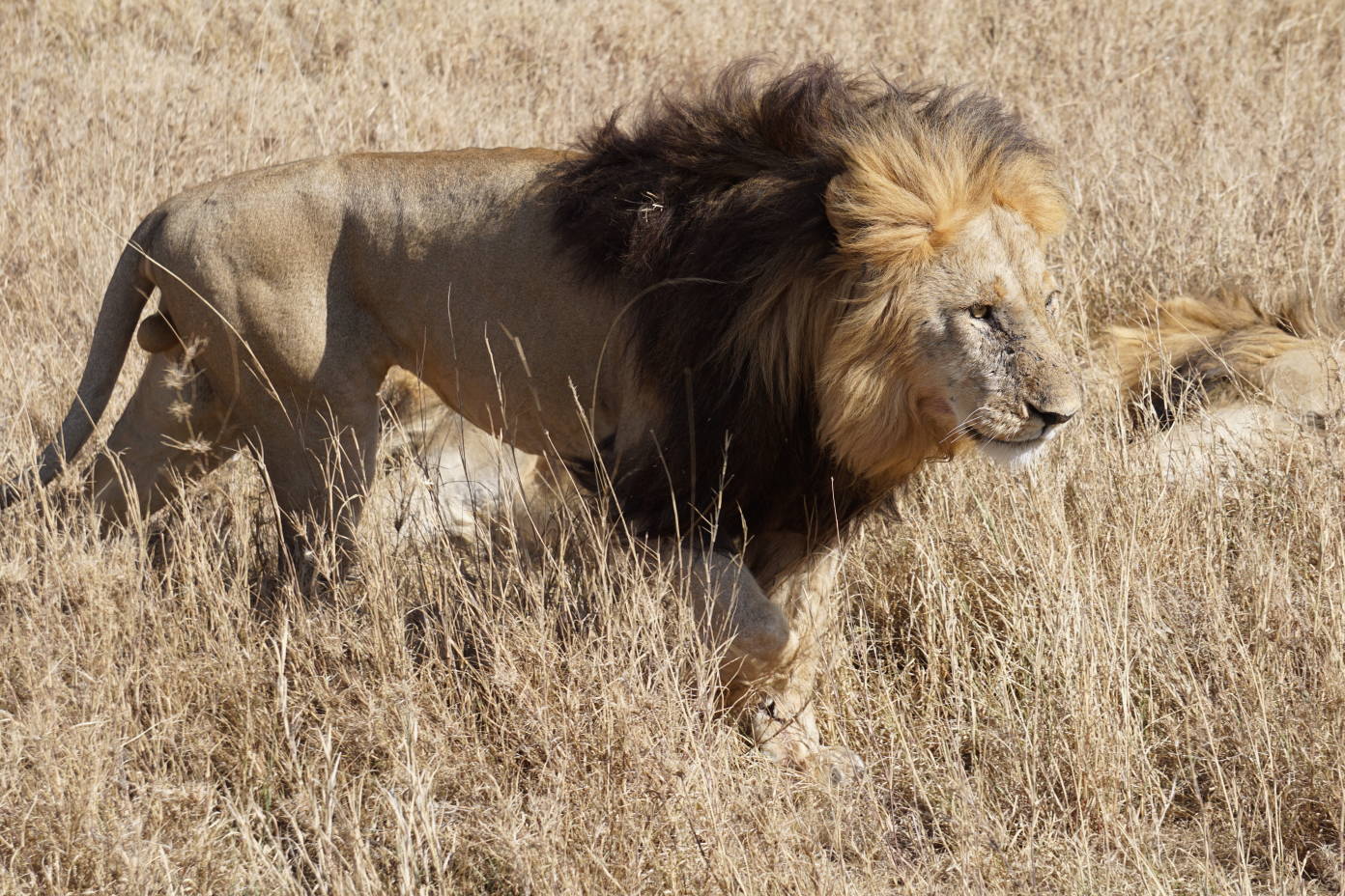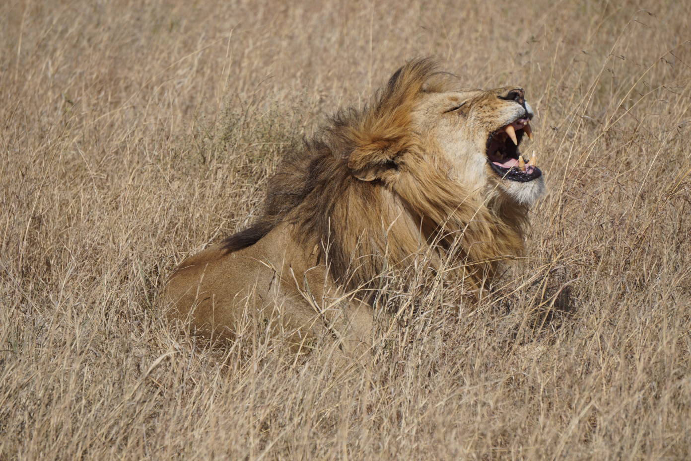 Por si fueran pocos animales en tan pocas horas, siguiendo nuestro camino nos encontramos con una coalición de leones macho descansando. Tomamos posiciones a dos metros de ellos y conseguimos unas fotografías espectaculares, captando el momento en que el león se levantaba para cambiar de sitio y bostezaba.